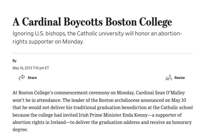 Wall Street Journal – “A Cardinal Boycotts Boston College”